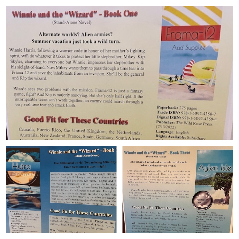 As mentioned in my last post, my book kiddos will be heading to Germany to a big book fair in Frankfurt in October. They get to go because I took advantage of an opportunity through IBPA (Independent Book Publishers Association) to have my books displayed at the book fair. Besides sending them my three books, they also asked for a 3-book, single flyer that required a boatload of information, including the publisher’s name, a 15-word or less description of each book, prices, and ISBNs. Also, since my books would be displayed on one of the top shelves, I should send “sell sheets” for each book. Those pages would go inside a binder for prospective publishers to peruse.